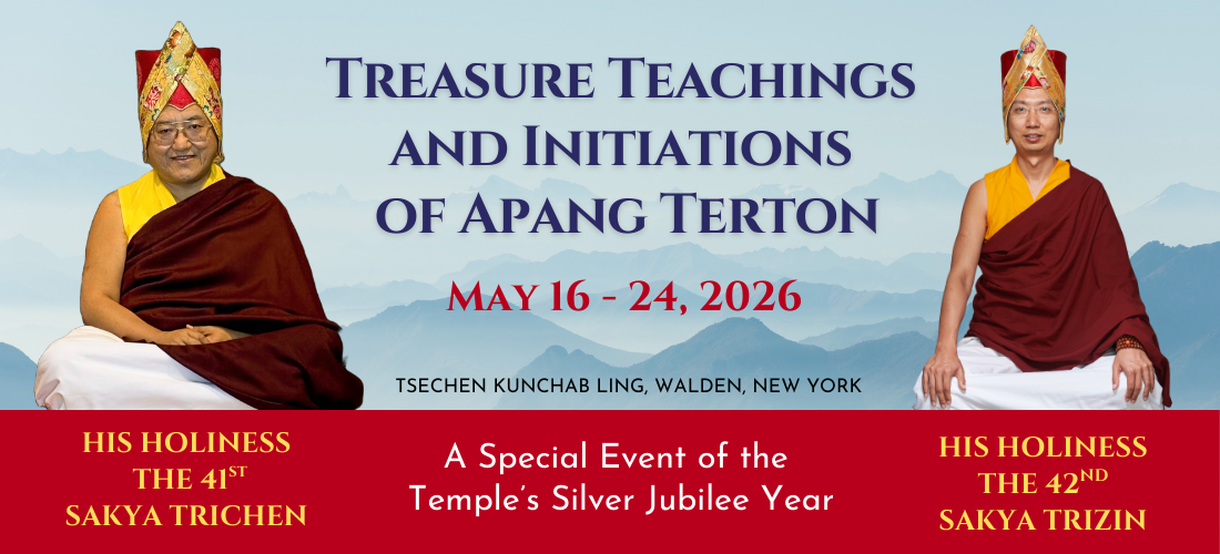 Venerable Khenpo Kalsang Gyaltsen is delighted to announce that from May 16-24, His Holiness the 41st Sakya Trichen will bestow the terma treasure initiations of the great mahasiddha Apang Terton at Tsechen Kunchab Ling. In addition, His Holiness the 42nd Sakya Trizin will bestow additional teachings, transmissions, and practice instructions from Apang Terton as part of the program.